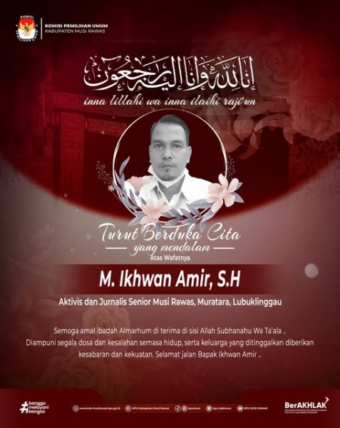 #TemanPemilih, segenap jajaran KPU Kabupaten Musi Rawas turut berduka cita atas meninggalnya Bapak M. Ikhwan Amir, SH - seorang aktivis dan jurnalis senior Musi Rawas, Muratara, Lubuklinggau (MLM) .. Semoga amal baik Almarhum diterima Tuhan Yang Maha Esa serta keluarga yang ditinggalkan diberi kekuatan dan ketabahan .. #KPUMelayani ------------------------------- Find Us On: Facebook: KPU Kabupaten Musi Rawas Instagram: kpumura Tiktok: KPU MUSI RAWAS Youtube: KPU MUSI RAWAS Twitter: KPU Kabupaten Musi Rawas Website: https://kab-musirawas.kpu.go.id. Alamat: Jl. Lintas Sumatera Lahat-Lubuklinggau, Ps. Muara Beliti, Kabupaten Musi Rawas, Sumatera Selatan 31661 ....