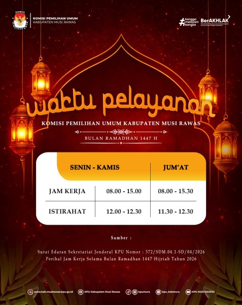 #TemanPemilih, Kami informasikan penetapan jam kerja dan jam pelayanan di KPU Kabupaten Musi Rawas pada Bulan Ramadhan 1447 H / 2026 M .. #KPUMelayani ------------------------------- Find Us On: Facebook: KPU Kabupaten Musi Rawas Instagram: kpumura Tiktok: KPU MUSI RAWAS Youtube: KPU MUSI RAWAS Twitter: KPU Kabupaten Musi Rawas Website: https://kab-musirawas.kpu.go.id. Alamat: Jl. Lintas Sumatera Lahat-Lubuklinggau, Ps. Muara Beliti, Kabupaten Musi Rawas, Sumatera Selatan 31661 ....