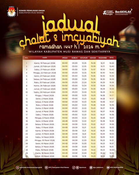 #TemanPemilih, berikut kami informasikan jadwal Imsakiyah Ramadhan 1447 H / 2026 M untuk Wilayah Kabupaten Musi Rawas dan sekitarnya .. #KPUMelayani ------------------------------- Find Us On: Facebook: KPU Kabupaten Musi Rawas Instagram: kpumura Tiktok: KPU MUSI RAWAS Youtube: KPU MUSI RAWAS Twitter: KPU Kabupaten Musi Rawas Website: https://kab-musirawas.kpu.go.id. Alamat: Jl. Lintas Sumatera Lahat-Lubuklinggau, Ps. Muara Beliti, Kabupaten Musi Rawas, Sumatera Selatan 31661 ....