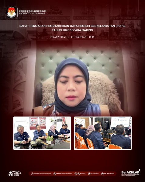 #TemanPemilih , KPU Kabupaten Musi Rawas mengikuti Rapat Persiapan PDPB (Pemuktahiran Data Pemilih Berkelanjutan) Tahun 2026 di Kantor KPU Musi Rawas (24/02/2026).. Rapat Persiapan PDPB Tahun 2026 menjadi langkah strategis dalam memastikan proses pemutakhiran data pemilih berjalan akurat, transparan, dan berkelanjutan. Melalui Persiapan PDPB 2026, memperkuat koordinasi dan komitmen dalam menghadirkan data pemilih yang mutakhir dan terpercaya. #KPUMelayani ______________________________ Find Us On: Facebook: KPU Kabupaten Musi Rawas Instagram: kpumura Tiktok: KPU MUSI RAWAS Youtube: KPU MUSI RAWAS Twitter: KPU Kabupaten Musi Rawas Website: https://kab-musirawas.kpu.go.id. Alamat: Jl. Lintas Sumatera Lahat-Lubuklinggau, Ps. Muara Beliti, Kab Musi Rawas, Sumsel 31661 ....