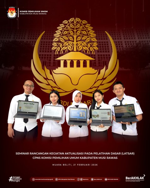 #TemanPemilih, Calon Pegawai Negeri Sipil (CPNS) KPU Kabupaten Musi Rawas telah mengikuti dan menyelesaikan Seminar Rancangan Kegiatan Aktualisasi pada Pelatihan Dasar (Latsar) CPNS yang diselenggarakan Badan Kepegawaian dan Sumber Daya Manusia Pemerintah Provinsi Sumatera Selatan secara daring (21/2/2026) .. #KPUMelayani ______________________________ Find Us On: Facebook: KPU Kabupaten Musi Rawas Instagram: kpumura Tiktok: KPU MUSI RAWAS Youtube: KPU MUSI RAWAS Twitter: KPU Kabupaten Musi Rawas Website: https://kab-musirawas.kpu.go.id. Alamat: Jl. Lintas Sumatera Lahat-Lubuklinggau, Ps. Muara Beliti, Kab Musi Rawas, Sumsel 31661 ....