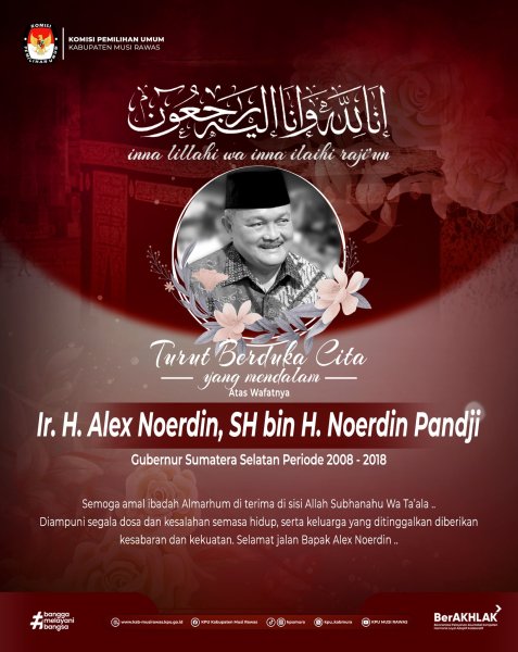 #TemanPemilih, segenap jajaran KPU Kabupaten Musi Rawas turut berduka cita atas meninggalnya Bapak Ir. H. Alex Noerdin, SH bin H. Noerdin Pandji (Gubernur Sumatera Selatan Periode 2008 - 2018) .. Semoga amal baik Almarhum diterima Tuhan Yang Maha Esa serta keluarga yang ditinggalkan diberi kekuatan dan ketabahan .. #KPUMelayani ------------------------------- Find Us On: Facebook: KPU Kabupaten Musi Rawas Instagram: kpumura Tiktok: KPU MUSI RAWAS Youtube: KPU MUSI RAWAS Twitter: KPU Kabupaten Musi Rawas Website: https://kab-musirawas.kpu.go.id. Alamat: Jl. Lintas Sumatera Lahat-Lubuklinggau, Ps. Muara Beliti, Kabupaten Musi Rawas, Sumatera Selatan 31661 ....