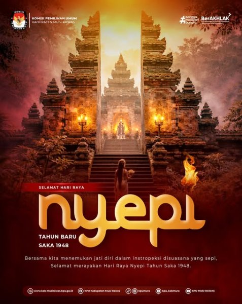 #TemanPemilih, Segenap Jajaran Komisi Pemilihan Umum Kabupaten Musi Rawas mengucapkan Selamat Hari Raya Nyepi Tahun Baru Saka 1948, 19 Maret 2026 .. Mari bersama kita menemukan jati diri dalam instropeksi diri disuasana yang sepi .. #KPUMelayani ------------------------------- Find Us On: Facebook: KPU Kabupaten Musi Rawas Instagram: kpumura Tiktok: KPU MUSI RAWAS Youtube: KPU MUSI RAWAS Twitter: KPU Kabupaten Musi Rawas Website: https://kab-musirawas.kpu.go.id. Alamat: Jl. Lintas Sumatera Lahat-Lubuklinggau, Ps. Muara Beliti, Kabupaten Musi Rawas, Sumatera Selatan 31661 ....