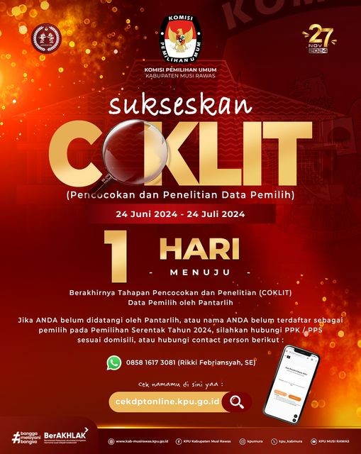 #TemanPemiih, Sukseskan COKLIT (Pencocokan dan Penelitian) Data Pemilih oleh Pantarlih yang berlangsung dari tanggal 24 Juni 2024 - 24 Juli 2024 .. .