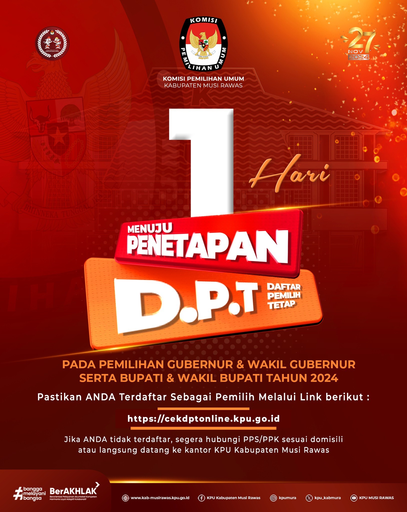 #TemanPemilih, 1 Hari lagi menuju penetapan Daftar Pemilih Tetap (DPT), pastikan namamu terdaftar dalam DPT Pada Pemilihan Gubernur & Wakil Gubernur serta Bupati dan Wakil Bupati Tahun 2024... .