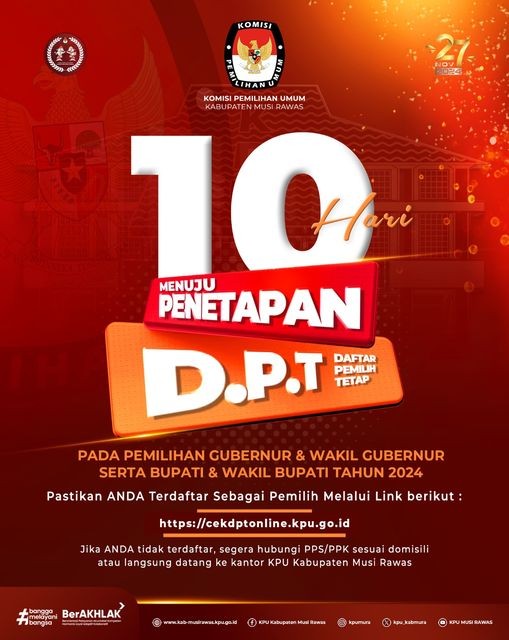 #Temanpemilih 10 Hari lagi menuju penetapan Daftar Pemilih Tetap (DPT) ayo pastikan namamu terdaftar dalam DPT. Cek melalui cekdptonline.kpu.go.id KPU Provinsi Sumatera Selatan KPU Republik Indonesia
