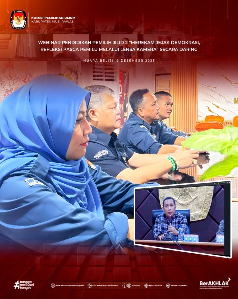 #TemanPemilih, KPU Kabupaten Musi Rawas yang diwakili oleh Ketua KPU Kabupaten Musi Rawas, Ibu Ania Trisna AD, Sekretaris KPU Kabupaten Musi Rawas, H. Nailul Azmi, Kasubbag SDM dan Parmas, Bapak Andriansah beserta staf mengikuti Webinar Pendidikan Pemilih Jilid 2 "Merekam Jejak Demokrasi, Refleksi Pasca Pemilu Melalui Lensa Kamera" yang dilaksanakan oleh KPU Provinsi Sumatera Selatan secara daring di Kantor KPU Kabupaten Musi Rawas (9/12/2025) ..