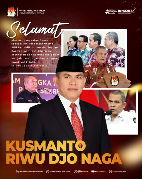 #TemanPemilih, KPU Kabupaten Musi Rawas mengucapkan Selamat atas pengangkatan Bapak Kusmanto Riwu Djo Naga sebagai Inspektur Utama KPU Republik Indonesia.