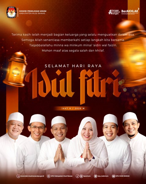 Segenap jajaran Komisi Pemilihan UmumKabupaten Musi Rawas mengucapkan Selamat Hari Raya Idul Fitri 1447 Hijriah ..