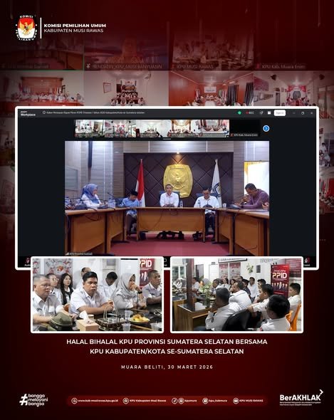 #TemanPemilih, Dalam rangka mempererat tali silahturahmi di lingkungan Sekretariat KPU Provinsi dan Sekretariat KPU Kabupaten/Kota se-Sumatera Selatan pasca Idul Fitri 1447 H. KPU Kabupaten Musi Rawas mengikuti Halal Bihalal Pasca Idul Fitri 1447 H yang dilaksanakan oleh KPU Provinsi Sumatera Selatan bersama KPU di 17 Kab/Kota se - Sumatera Selatan secara daring (30/3/2026) ..