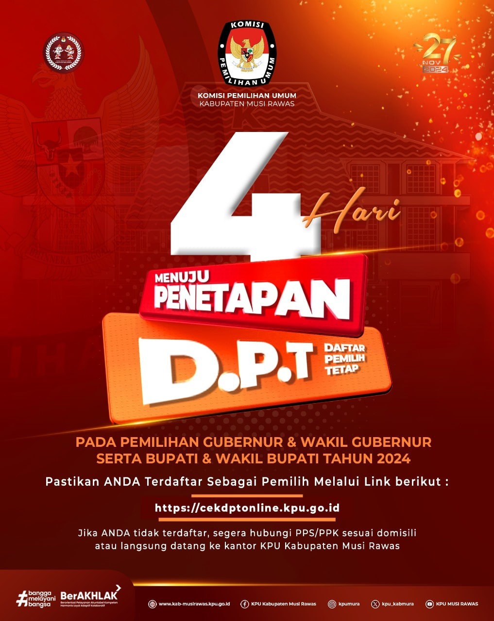 #TemanPemilih, 4 Hari lagi menuju penetapan Daftar Pemilih Tetap (DPT), pastikan namamu terdaftar dalam DPT Pada Pemilihan Gubernur & Wakil Gubernur serta Bupati dan Wakil Bupati Tahun 2024... .