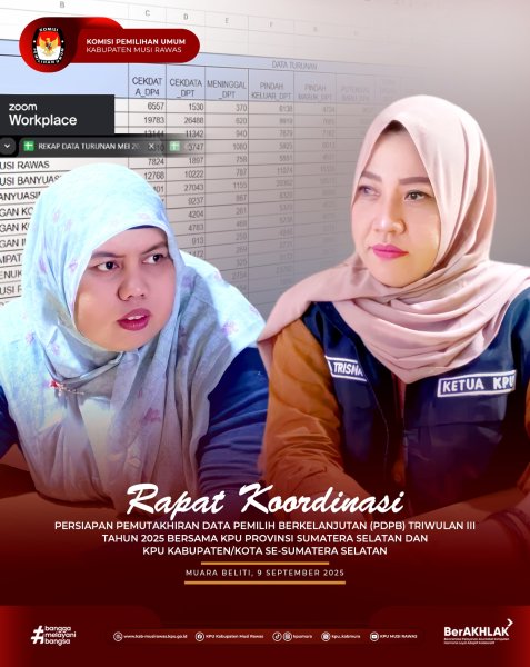 #TemanPemilih, KPU Kabupaten Musi Rawas mengikuti Rapat Koordinasi persiapan pemutakhiran Data Pemilih Berkelanjutan (PDPB) Triwulan III Tahun 2025 bersama KPU Provinsi Sumatera Selatan dan KPU Kabupaten/Kota Se-Sumatera Selatan secara daring di Kantor KPU Kabupaten Musi Rawas (9/9/2025) ..