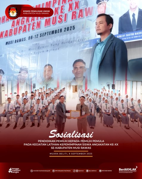 #TemanPemilih, Anggota KPU Kabupaten Musi Rawas, Bapak Yogi Juli Saputra, SP memberikan materi Pendidikan Pemilih kepada Pemilih Pemula dalam kegiatan Latihan Kepemimpinan Siswa Angkatan XX Se-Kabupaten Musi Rawas (9/9/2025) ..