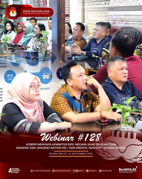 #TemanPemilih, Sekretariat KPU Kabupaten Musi Rawas mengikuti Webinar #128 KORPRI Menyapa ASN dengan tema Amazing ASN, Amazing Nation (13): “ASN Kreativ, Inovatif" secara daring di Kantor KPU Kabupaten Musi Rawas (12/9/2025) ..