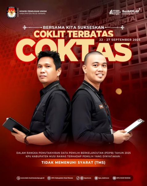 #TemanPemilih, KPU Kabupaten Musi Rawas akan melaksanakan Coklit Terbatas (COKTAS) terhadap Pemilih yang dinyatakan Tidak Memenuhi Syarat (TMS) di wilayah Kabupaten Musi Rawas yang dimulai pada tanggal 22 - 27 September 2025 ..