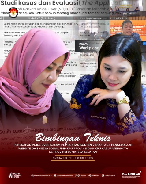 #TemanPemilih, KPU Kabupaten Musi Rawas mengikuti bimbingan teknis penerapan 'Voice Over' dalam pembuatan konten video pada pengelolaan Website dan Media Sosial Jaringan Dokumentasi dan Informasi Hukum (JDIH) KPU Provinsi dan KPU Kabupaten/ Kota secara daring di Kantor KPU Kabupaten Musi Rawas (1/10/2025) ..