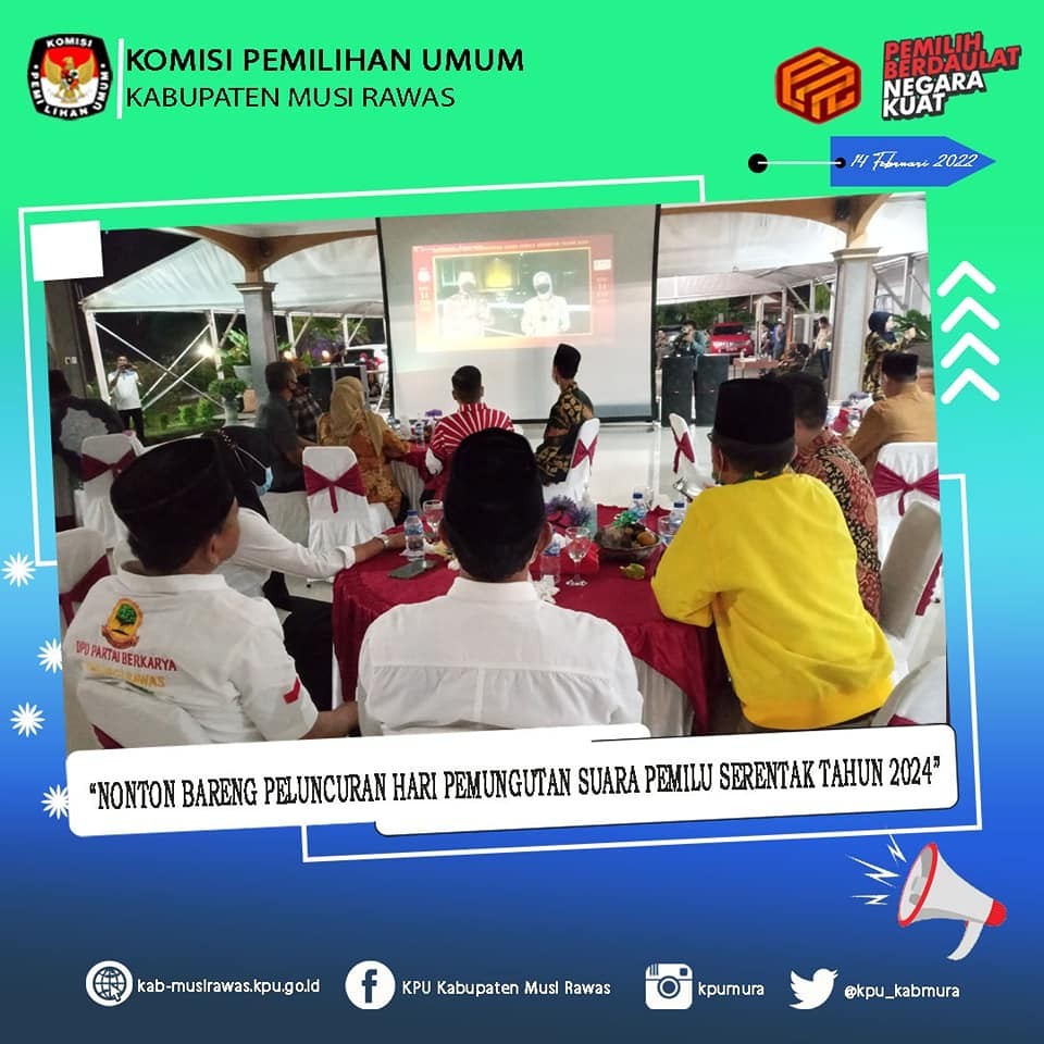 Senin (14/02), KPU Kabupaten Musi Rawas menyelenggarakan acara nonton bareng "Peluncuran Hari Pemungutan Suara Pemilu Serentak Tahun 2024" di Pendopoan Bupati Musi Rawas. Acara ini dihadiri langsung oleh Wakil Bupati Musi Rawas, Hj. Suwarti, S.I.P.,Forkopimda, Ketua Partai Politik, Bawaslu dan stakeholder lainnya. Kegiatan berjalan dengan lancar dari awal sampai dengan selesai.