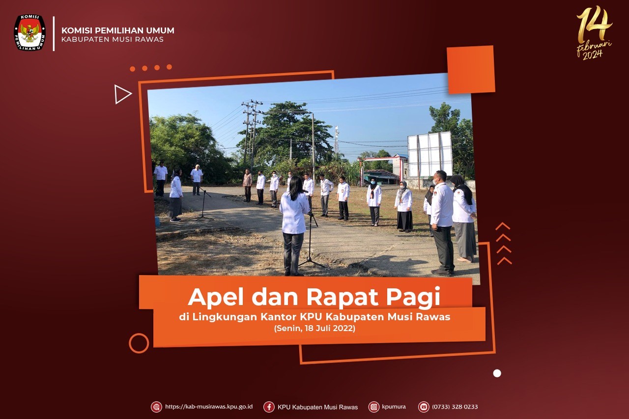 Senin, (19/07/2022) KPU Kabupaten Musi Rawas melaksanakan kegiatan Apel Pagi di halaman kantor Komisi Pemilihan Umum Kabupaten Musi Rawas. Kegiatan Apel dipimpin oleh Ibu Erlina Nasution, S.Kom.,M.M. (Kasubbag Teknis Pemilu dan Hupmas) sebagai Pembina Apel. Apel berjalan dengan lancar dan khidmat dilanjutkan dengan rapat mingguan yang dipimpin oleh Bapak H. Nailul Azmi, S.Psi.,M.M. (Sekretaris KPU Kabupaten Musi Rawas).