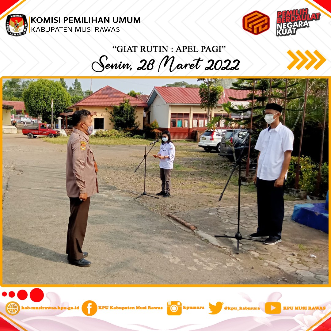 Senin (28/03), KPU Kabupaten Musi Rawas melaksanakan kegiatan Apel Pagi dan Rapat Rutin. Kegiatan diikuti oleh Komisioner, PNS dan staf PPnPN di lingkungan Sekretariat KPU Kabupaten Musi Rawas. Kegiatan berjalan dengan lancar.
