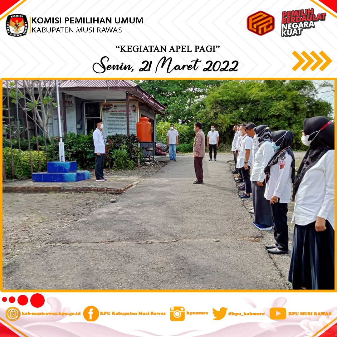 Senin (21/03), KPU Kabupaten Musi Rawas melaksanakan apel pagi dan rapat rutin di kantor KPU Kabupaten Musi Rawas. Kegiatan diikuti oleh Komisioner, PNS dan staf PPnPN di lingkungan KPU Kabupaten Musi Rawas. Kegiatan apel pagi dan rapat rutin berjalan dengan lancar..