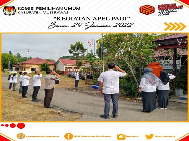 Apel Pagi dan Rapat Rutin KPU Kabupaten Musi Rawas (24/01/2022). Apel Pagi dan Rapat Rutin diikuti oleh Komisioner, PNS dan staf honorer di lingkungan Komisi Pemilihan Umum Kabupaten Musi Rawas. Apel Pagi dan Rapat Rutin berjalan dengan lancar.