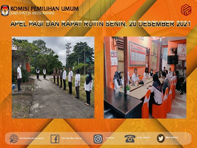 Senin, 20 Desember 2021, KPU Kabupaten Musi Rawas melaksanakan apel pagi dan rapat rutin di kantor Komisi Pemilihan Umum Kabupaten Musi Rawas. Apel pagi dipimpin oleh Bapak Andriansah, S.H. selaku pembina apel. Apel berjalan dengan lancar dilanjutkan rapat rutin yang dipimpin oleh Bapak H. Nailul, Azmi, S.Psi.,M.M.