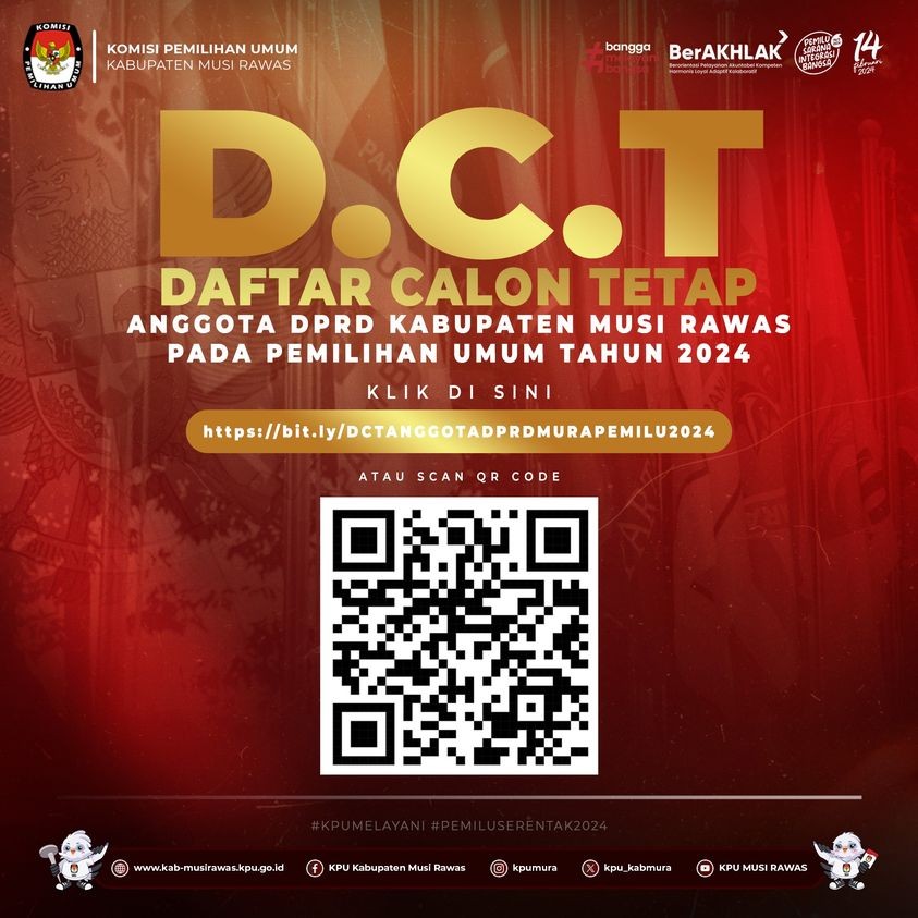 #TemanPemilih, Berdasarkan Pengumuman KPU Kabupaten Musi Rawas Nomor 681/PL.01.4-Pu/1605/2023 tanggal 04 November 2023, berikut kami informasikan Daftar Calon Tetap (DCT) Anggota DPRD Kabupaten Musi Rawas untuk Pemilihan Umum Tahun 2024 yang telah ditetapkan oleh KPU Kabupaten Musi Rawas dalam Keputusan KPU Kabupaten Musi Rawas Nomor 461 Tahun 2023 tentang Daftar Calon Tetap Anggota Dewan Perwakilan Rakyat Daerah Kabupaten Musi Rawas dalam Pemilihan Umum Tahun 2024 pada tanggal 3 November tahun 2023 sesuai dengan Keputusan KPU Nomor 996 Tahun 2023 tentang Pedoman Teknis Penyusunan Daftar Calon Sementara dan Penetapan Daftar Calon Tetap Anggota Dewan Perwakilan Rakyat, Dewan Perwakilan Rakyat Daerah Provinsi dan Dewan Perwakilan Rakyat Daerah Kabupaten/Kota sebagaimana terakhir kali diubah dengan Keputusan KPU Nomor 1026 Tahun 2023.