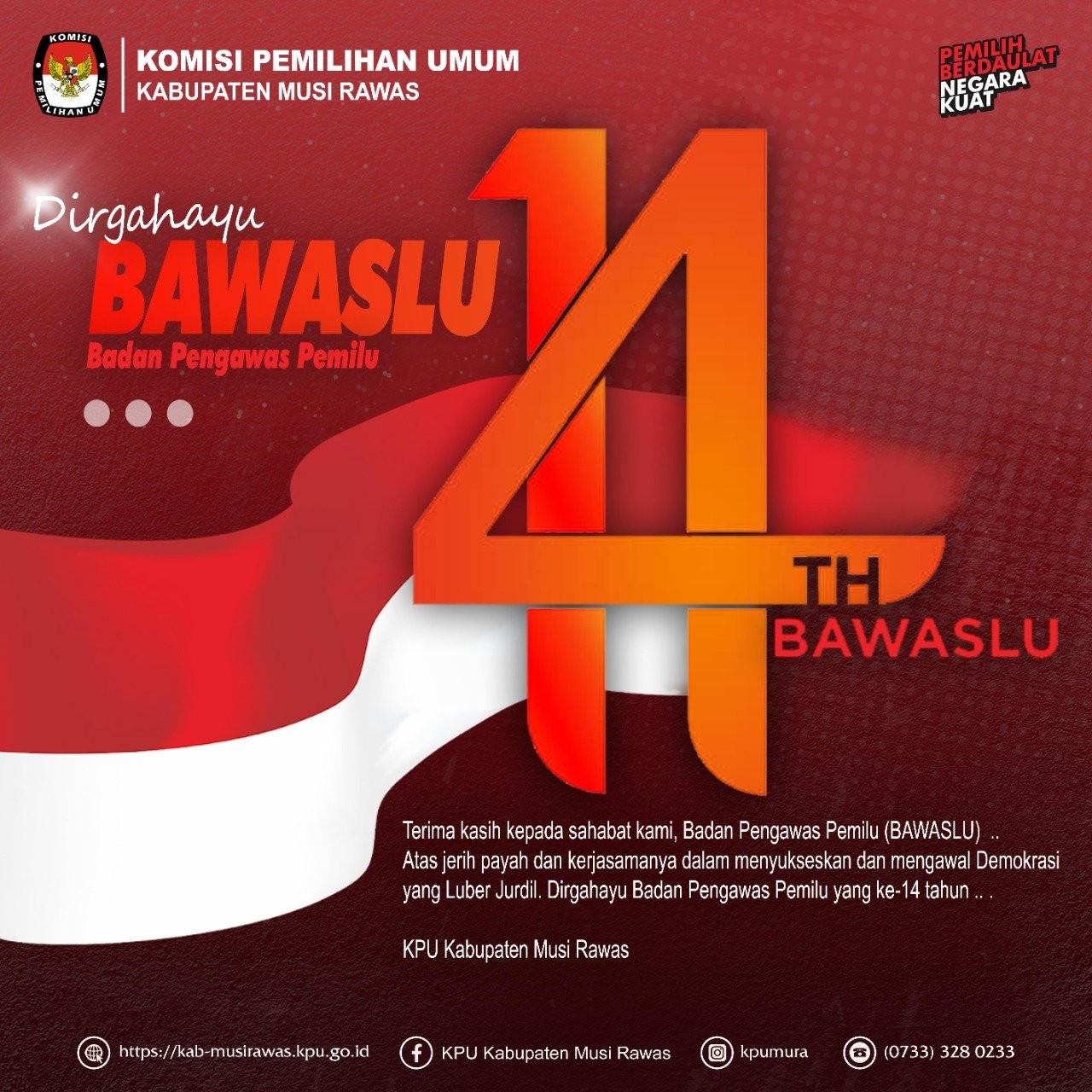 KPU Kabupaten Musi Rawas mengucapkan "Dirgahayu ke-14 tahun" kepada Bawaslu. Mengawasi Pemilu untuk demokrasi maju...