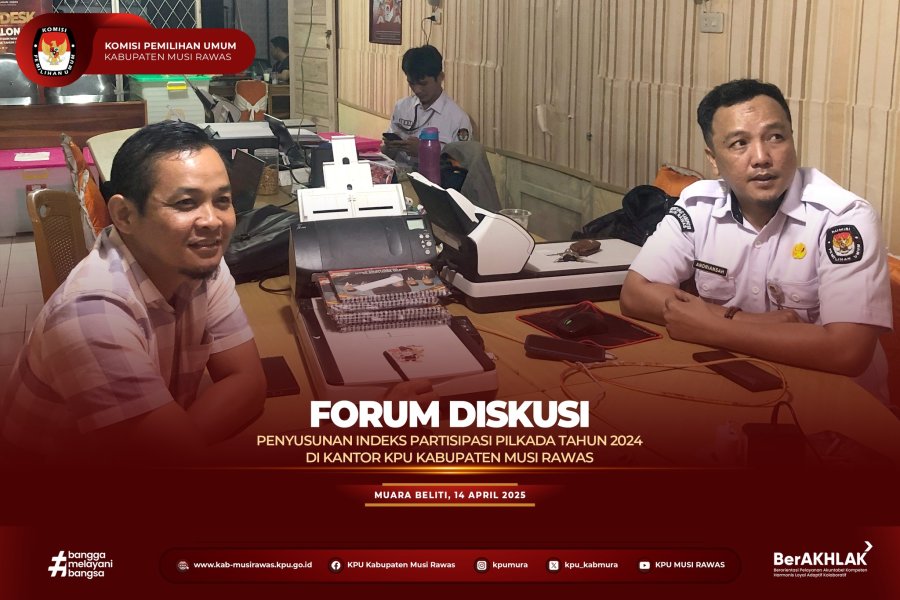 #TemanPemilih, KPU Kabupaten Musi Rawas mengikuti Forum Diskusi Penyusunan Indeks Partisipasi Pilkada Tahun 2024 secara daring di Kantor KPU Kabupaten Musi Rawas (14/4/2025) ..