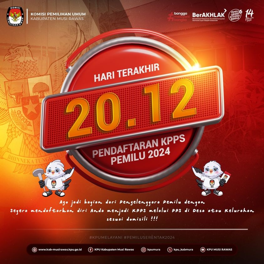 #TemanPemillih, diberitahukan kepada seluruh #TemanPemilih masyarakat Kabupaten Musi Rawas, bahwa hari ini merupakan hari terakhir pendaftaran Kelompok Penyelenggara Pemungutan Suara (KPPS) ..