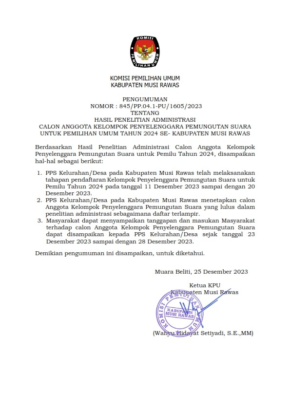 #TemanPemilih, berikut kami sampaikan hasil penelitian administrasi calon anggota Kelompok Penyelenggara Pemungutan Suara (KPPS) untuk Pemilu Tahun 2024 Se-Kabupaten Musi Rawas berdasarkan Pengumuman KPU Kabupaten Musi Rawas tanggal 25 Desember 2023 Nomor : 845/PP.04.1-PU/1605/2023.