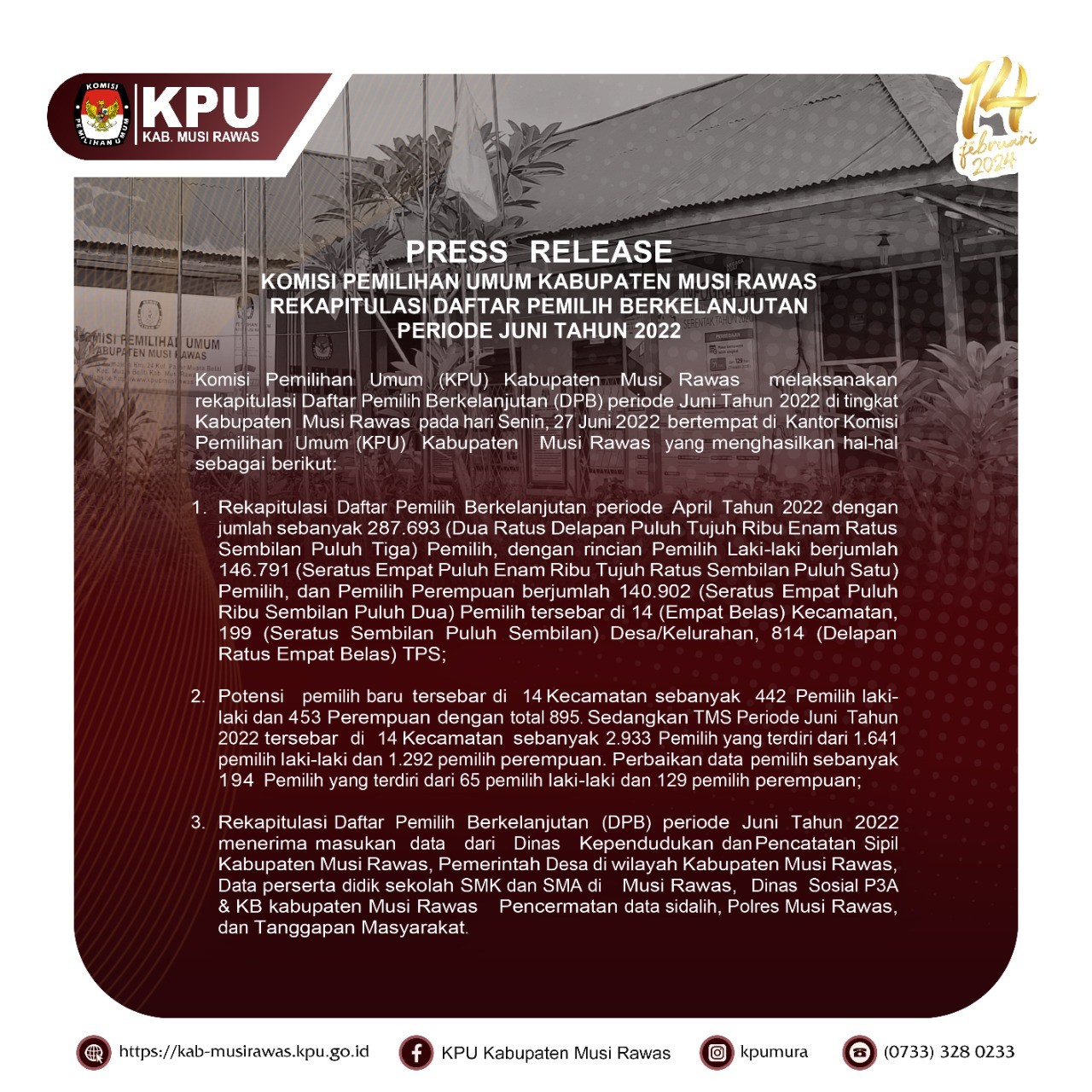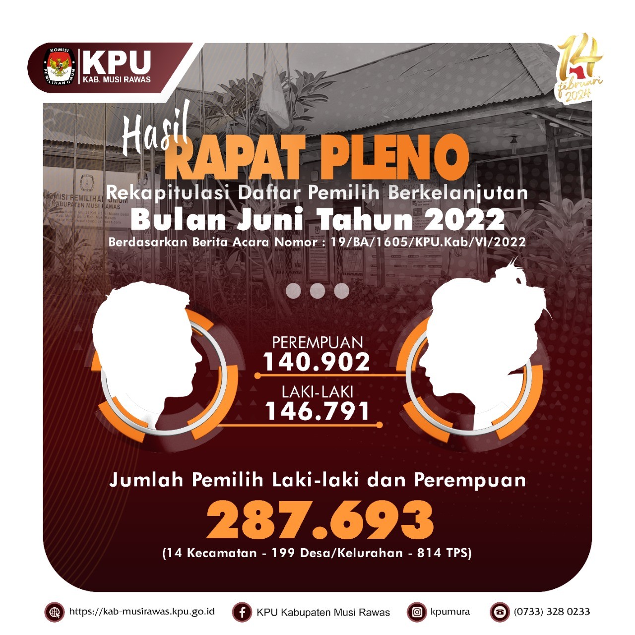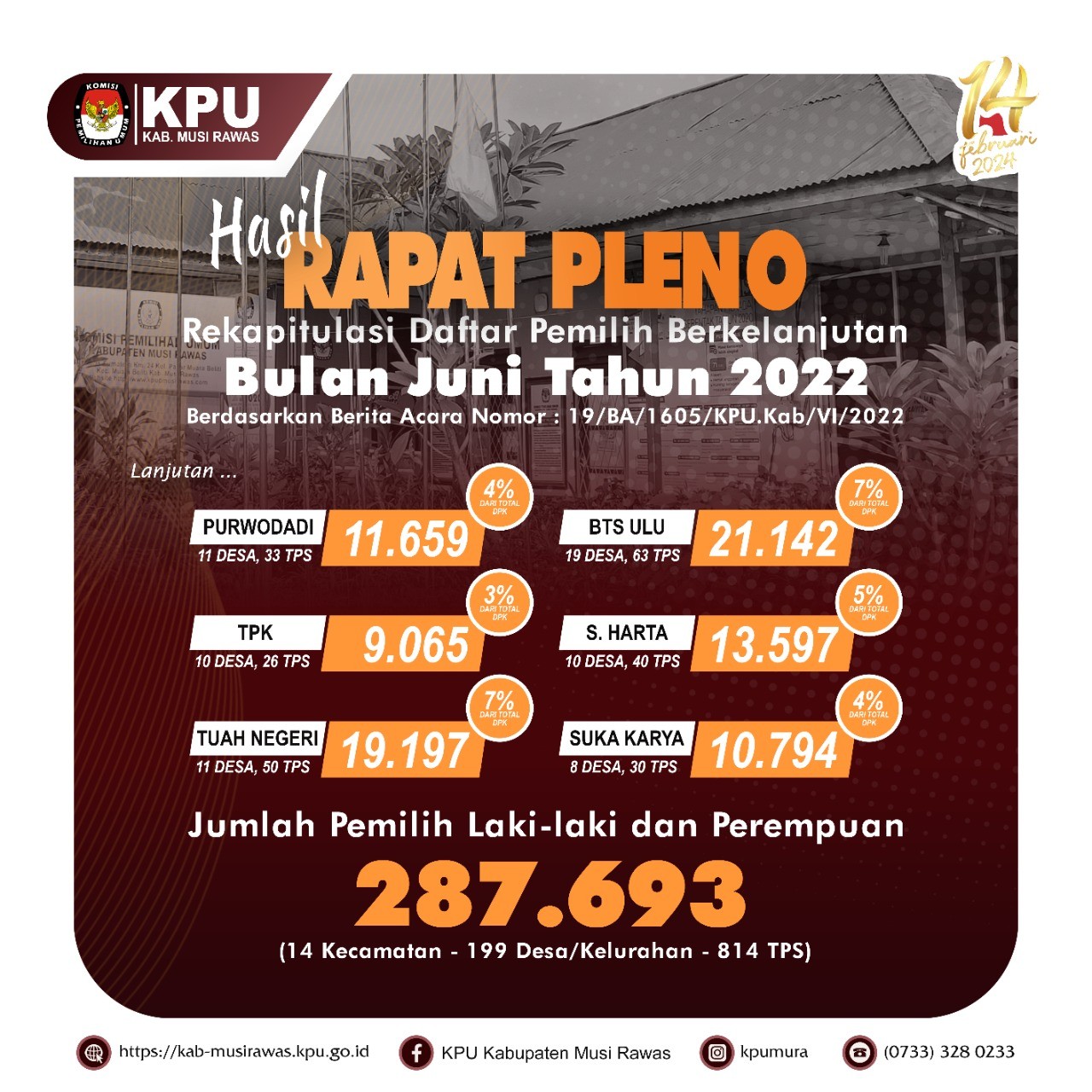 Berikut hasil Rapat Pleno Rekapitulasi Daftar Pemilih Berkelanjutan Bulan Juni Tahun 2022 KPU Kabupaten Musi Rawas: