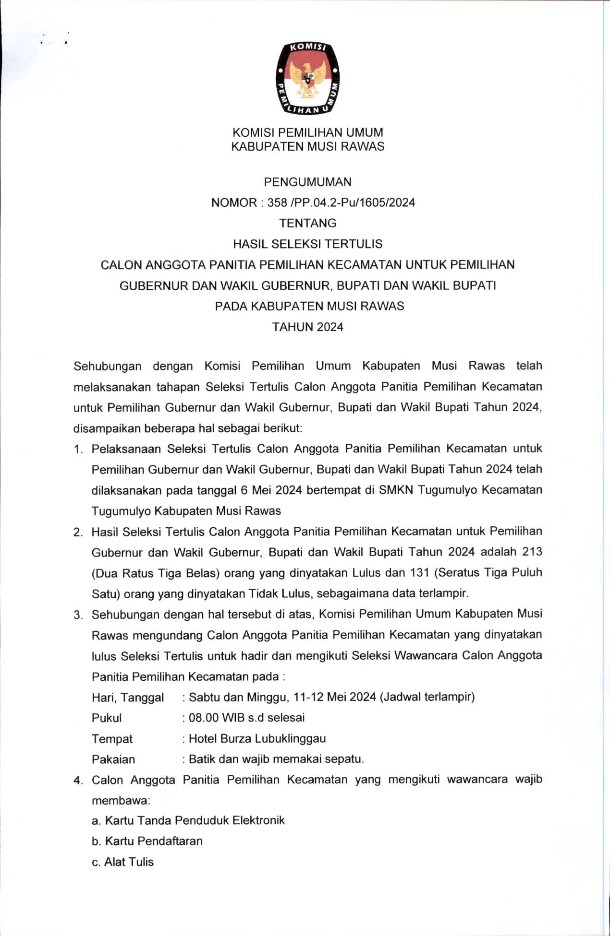 #TemanPemilih, berikut kami informasikan Pengumuman KPU Kabupaten Musi Rawas Nomor 358/PP.04.2-Pu/1605/2024 Tentang Hasil Seleksi Tes Tertulis Calon Anggota Panitia Pemilihan Kecamatan (PPK) Untuk Pemilihan Gubernur dan Wakil Gubernur, Bupati dan Wakil Bupati Pada Kabupaten Musi Rawas Tahun 2024 .