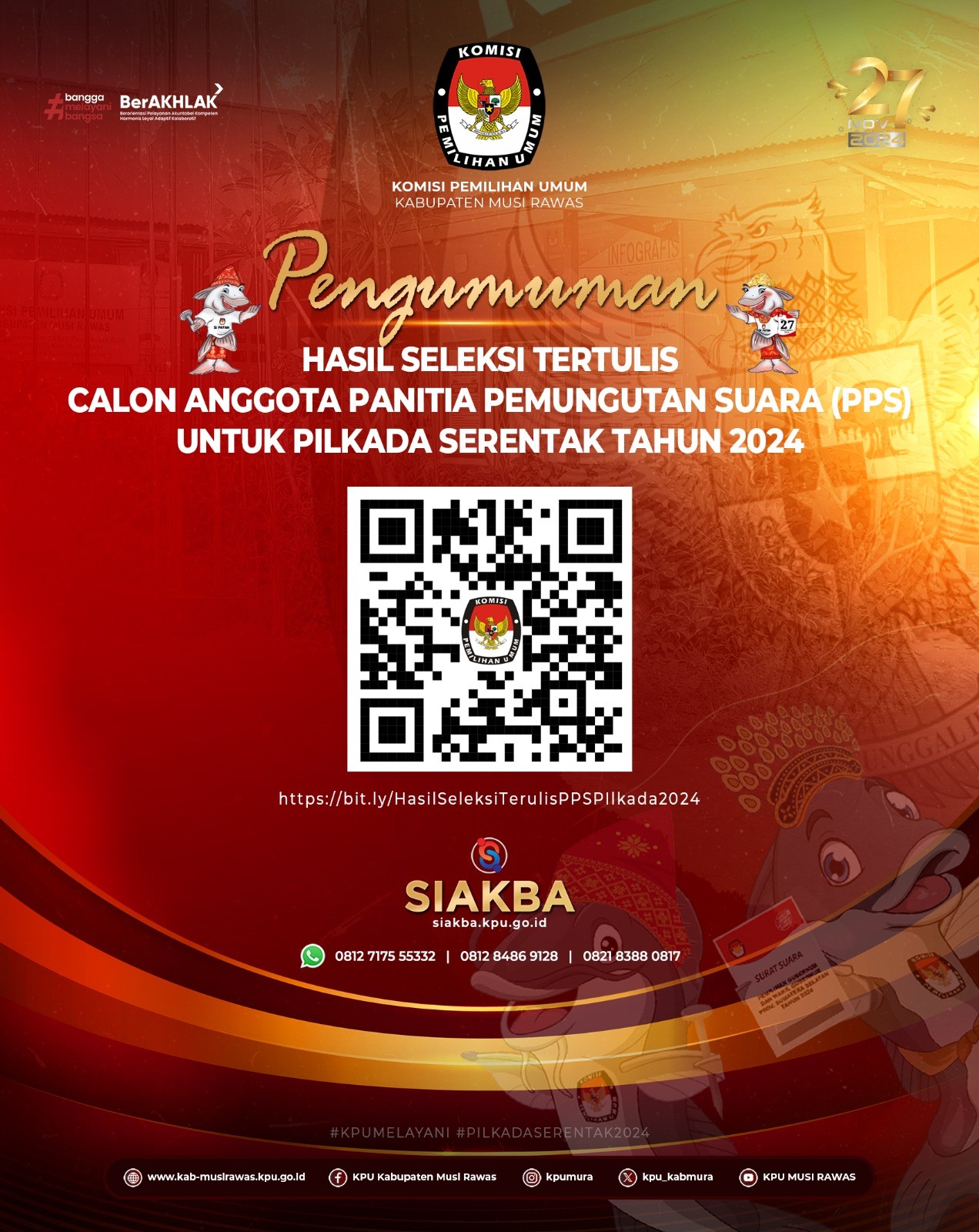 #TemanPemilih, berikut kami umumkan Pengumuman KPU Kabupaten Musi Rawas Nomor : 389/PP.04.2-Pu/1605/2024 Tentang Hasil Seleksi Tertulis Calon Anggota Panitia Pemungutan Suara (PPS) Untuk Pemilihan Gubernur dan Wakil Gubernur, Bupati dan Wakil Bupati Pada Kabupaten Musi Rawas Tahun 2024 serta juga kami umumkan Jadwal Seleksi Wawancara sebagaimana terlampir ..