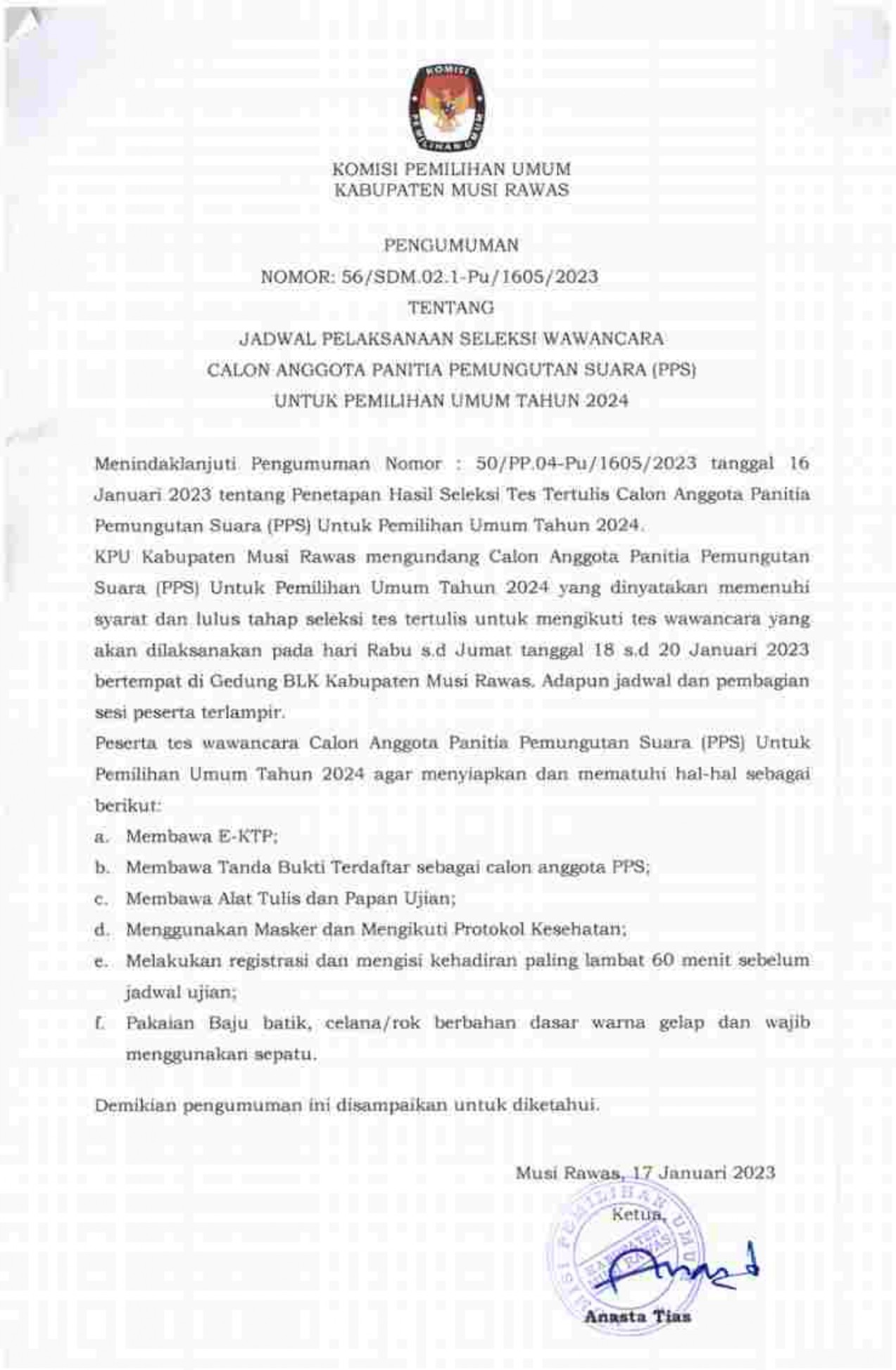 Jadwal Seleksi Wawancara Calon Panitia Pemungutan Suara (PPS) untuk Pemilu Tahun 2024 di Kabupaten Musi Rawas