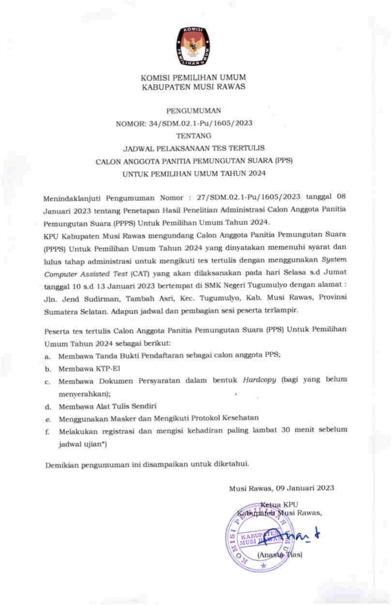 Berikut kami sampaikan jadwal ujian tertulis berbasis CAT (per sesi) calon anggota Panitia Pemungutan Suara (PPS) untuk Pemilu Tahun 2024. Selengkapnya dapat dilihat/diunduh di link berikut :