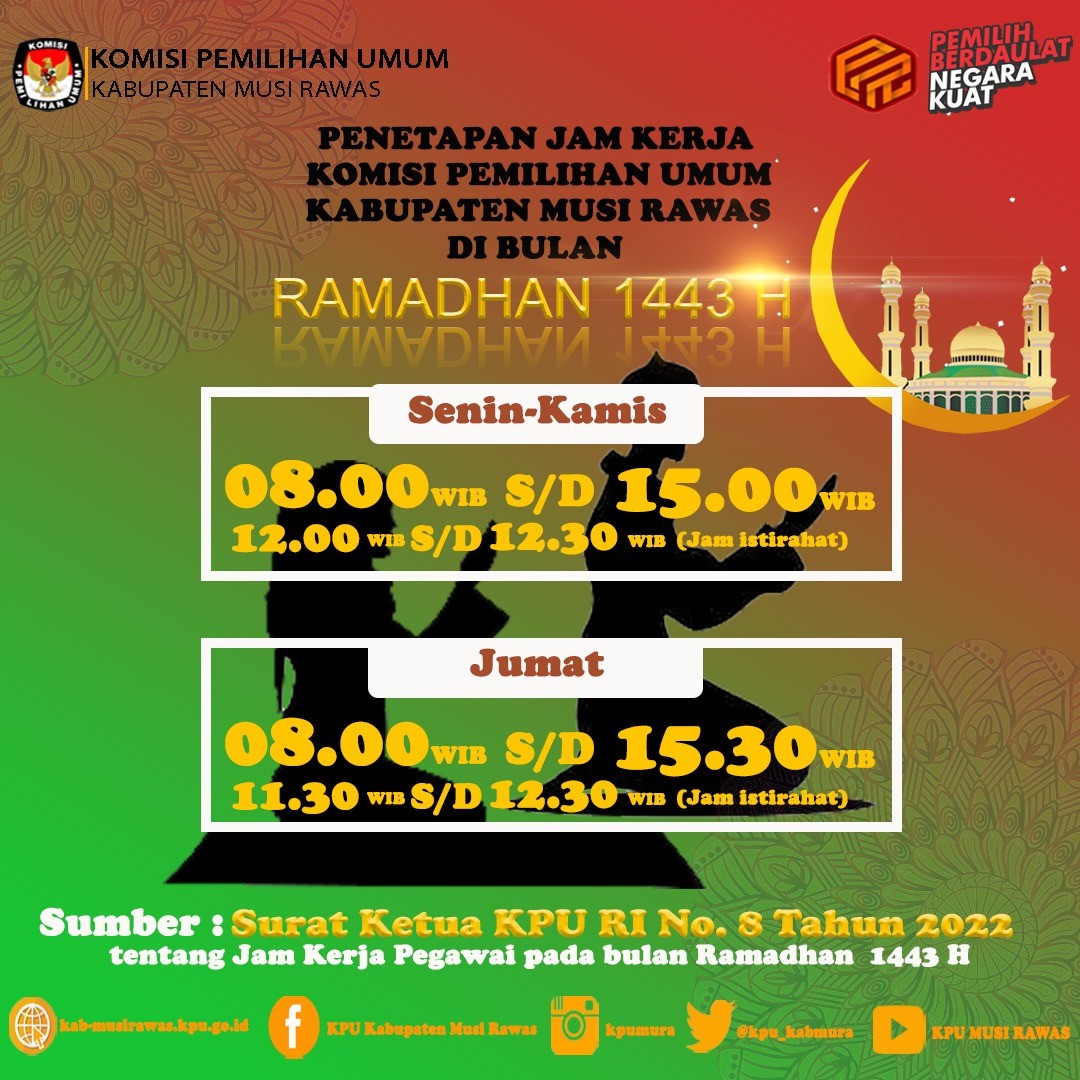 Berikut jam kerja di lingkungan Komisi Pemilihan Umum Kabupaten Musi Rawas selama bulan suci Ramadhan 1443 H..