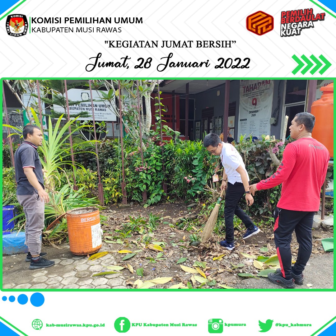 Dalam rangka menjaga kebersihan lingkungan kerja, KPU Kabupaten Musi Rawas kembali melaksanakan kegiatan Jumat Bersih di lingkungan kantor KPU Kabupaten Musi Rawas. Kegiatan ini diikuti Komisioner, PNS dan pegawai PPnPN di lingkungan KPU Kabupaten Musi Rawas. Kegiatan berjalan dengan lancar. (28/02)