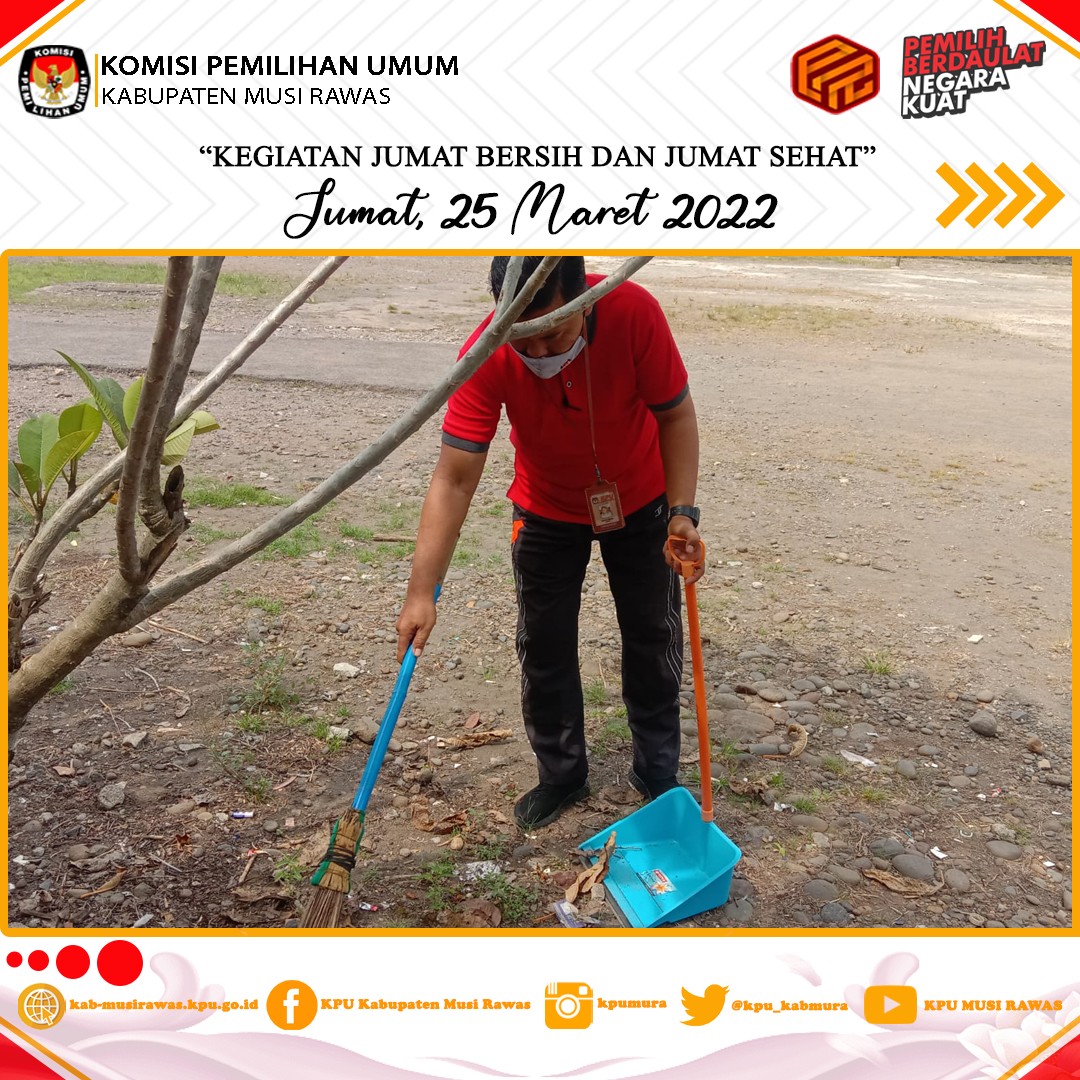 Jumat (25/03), KPU Kabupaten Musi Rawas melaksanakan kegiatan Jumat Bersih dan Jumat Sehat di lingkungan kantor KPU Kabupaten Musi Rawas. Kegiatan ini diiikuti oleh Komisioner, PNS dan Staf PPnPN. Kegiatan ini dilaksanakan dalam rangka menjaga kebersihan lingkungan dan kesehatan para pegawai.