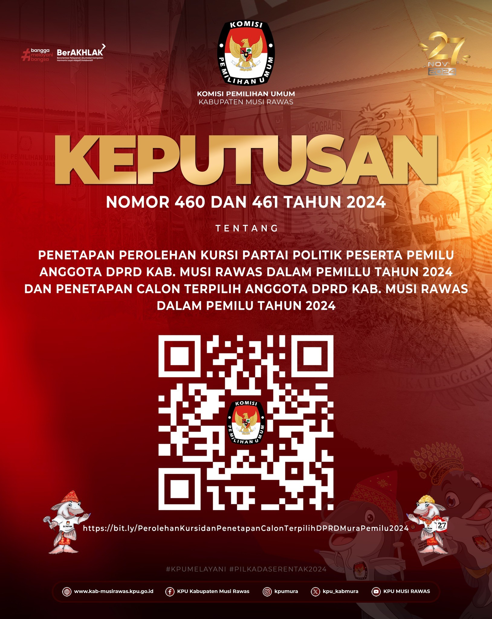 #TemanPemilih, berikut kami informasikan Keputusan KPU Kabupaten Musi Rawas Nomor 460 Tahun 2024 Tentang Penetapan Perolehan Kursi Partai Politik Peserta Pemilu Anggota DPRD Kabupaten Musi Rawas Dalam Pemilu Tahun 2024, dan Keputusan KPU Kabupaten Musi Rawas Nomor 461 Tahun 2024 Tentang Penetapan Calon Terpilih Anggota DPRD Kabupaten Musi Rawas Dalam Pemilu Tahun 2024 ..