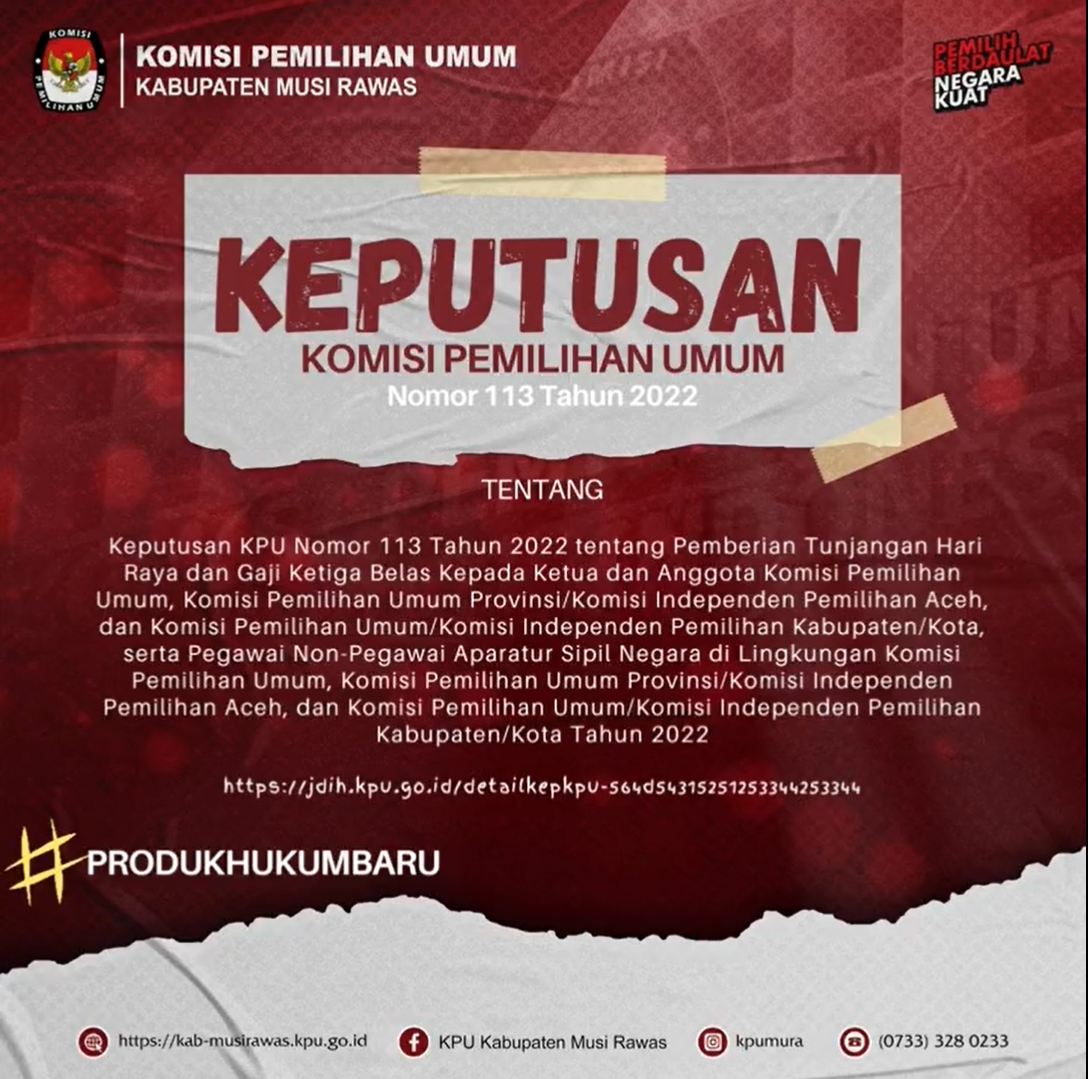 Lebaran sudah dekat, THR menanti..., yuk simak Keputusan Komisi Pemilihan Umum Nomor 113 Tahun 2022 Mengenai Pemberian THR dan gaji ke-13 kepada Ketua dan Anggota KPU beserta Pegawai Non-Pegawai ASN KPU..