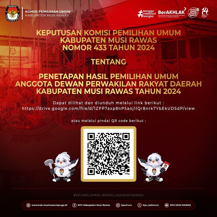 #TemanPemilih, berikut kami informasikan Penetapan Hasil Pemilihan Umum Anggota Dewan Perwakilan Rakyat Daerah (DPRD) Kabupaten Musi Rawas Tahun 2024 yang tertuang pada Keputusan KPU Kabupaten Musi Rawas Nomor 433 Tahun 2024 sekaligus mencabut Keputusan KPU Kabupaten Musi Rawas Nomor 432 Tahun 2024 dan dinyatakan *tidak berlaku*..