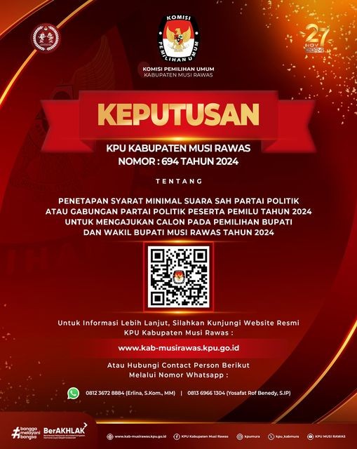 #TemanPemilih, Berikut Kami Informasikan Keputusan KPU Kabupaten Musi Rawas Nomor 694 Tahun 2024 Tentang Penetapan Syarat Minimal Suara Sah Partai Politik atau Gabungan Partai Politik Peserta Pemilihan Umum Tahun 2024 untuk Mengajukan Pasangan Calon pada Pemilihan Bupati dan Wakil Bupati Kabupaten Musi Rawas Tahun 2024 ..