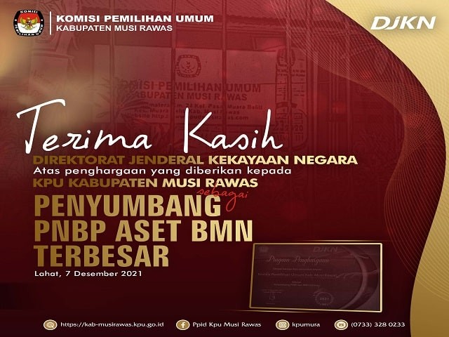 KPU Kabupaten Musi Rawas Meraih Penghargaan sebagai "Penyumbang PNBP Aset BMN Terbesar". Penghargaan diterima langsung oleh Sekretaris KPU Kabupaten Musi Rawas, Bapak H. Nailul Azmi, S.Psi.,M.M. di kantor KPKNL (Kantor Pelayanan Kekayaan Negara dan Lelang) pada hari Selasa,07/12/2021.
