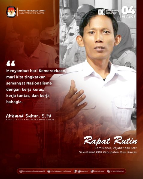 #TemanPemilih, Pada Rapat Rutin di Kantor KPU Kabupaten Musi Rawas Anggota KPU Kabupaten Musi Rawas, Bapak Akhmad Sukur, S.Pd menyampaikan pesan untuk meningkatkan semangat Nasionalisme dengan melakukan kerja keras, kerja tuntas, dan kerja bahagia dalam menyambut Hari Kemerdekaan Republik Indonesia .. (4/8/2025) ..