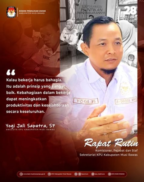 #TemanPemilih, Pada Rapat Rutin Komisioner dan Sekretariat KPU Kabupaten Musi Rawas, anggota KPU Kabupaten Musi Rawas, Bapak Yogi Juli Saputra, SP mengingatkan untuk bekerja dengan perasaan dan hati yang bahagia, karena hal tersebut dapat meningkatkan produktivitas dan kesejahteraan secara keseluruhan (28/7/2025) ..
