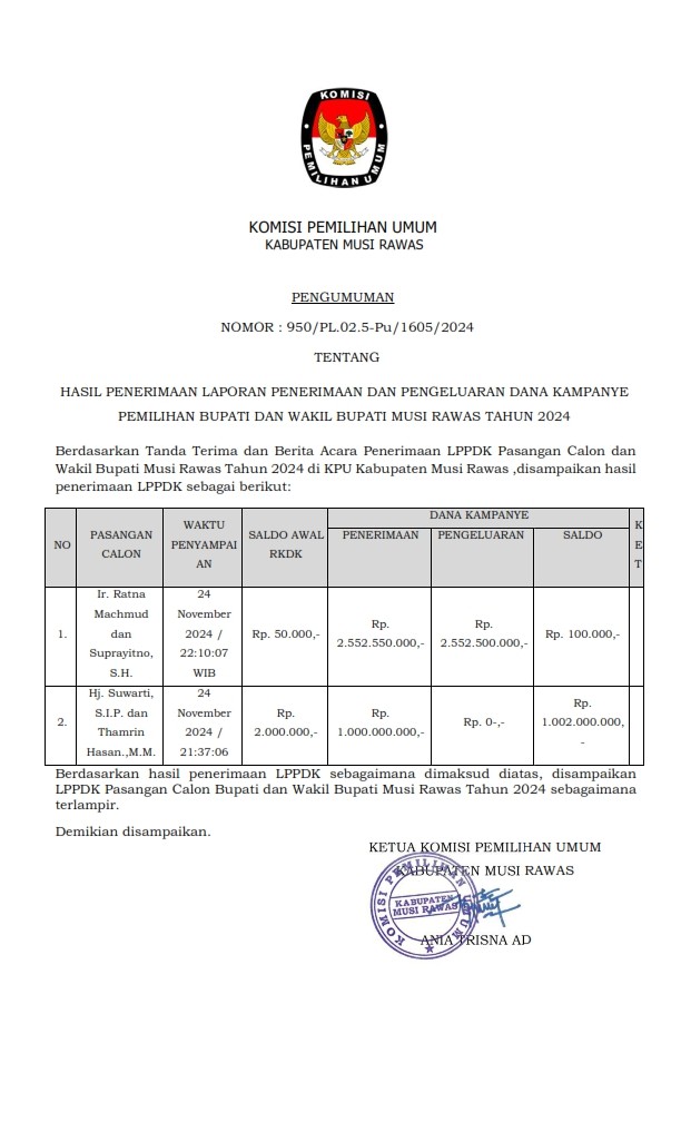 #TemanPemilih, Berikut kami sampaikan Laporan Penerimaan dan Pengeluaran Dana Kampanye (LPPDK) Pasangan Calon Bupati dan Wakil Bupati Musi Rawas Tahun 2024 untuk diketahui...