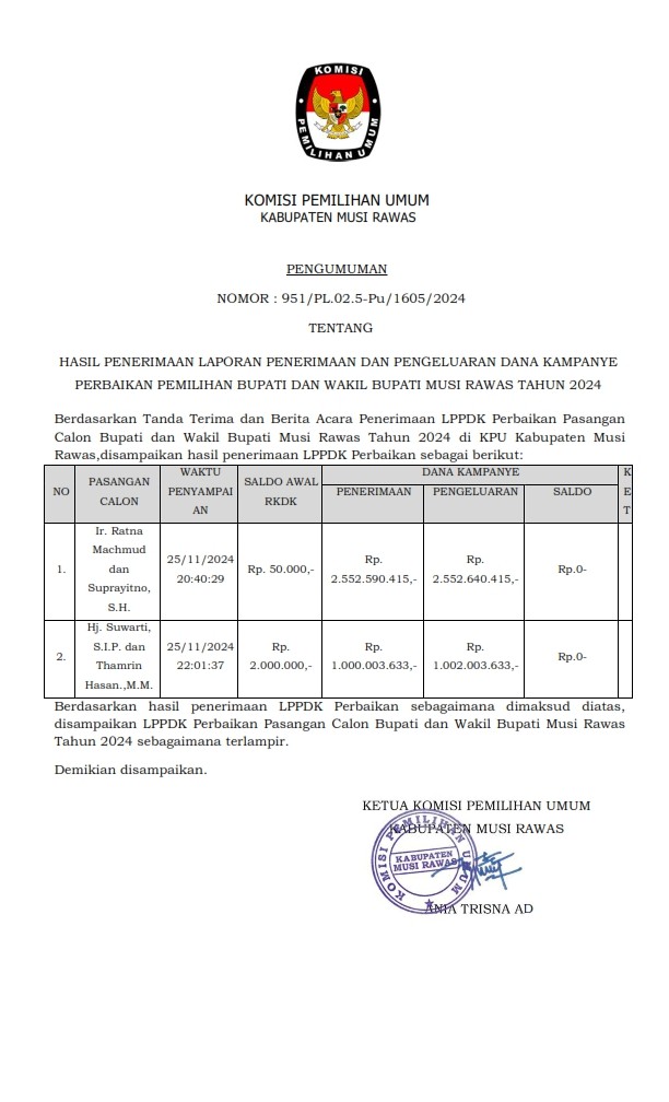 #TemanPemilih, Berikut kami sampaikan Laporan Penerimaan dan Pengeluaran Dana Kampanye (LPPDK) Perbaikan Pasangan Calon Bupati dan Wakil Bupati Musi Rawas Tahun 2024 untuk diketahui...