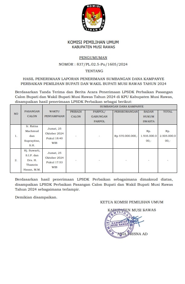 Berikut kami infokan pengumuman penerimaan Laporan Penerimaan Sumbangan Dana Kampanye (LPSDK) Perbaikan Pasangan Calon Bupati dan Wakil Bupati Musi Rawas Tahun 2024 :