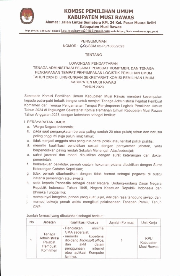 Berikut kami informasikan seputar Pengumuman Lowongan Pendaftaran "Tenaga Administrasi" Pejabat Pembuat Komitmen dan "Tenaga Pengamanan" Tempat Penyimpanan Logistik Pemilihan Umum Tahun 2024 di lingkungan Sekretariat KPU Kabupaten Musi Rawas beserta persyaratan, tata cara pendaftaran dan jadwal seleksi yang terlampir sebagai berikut :